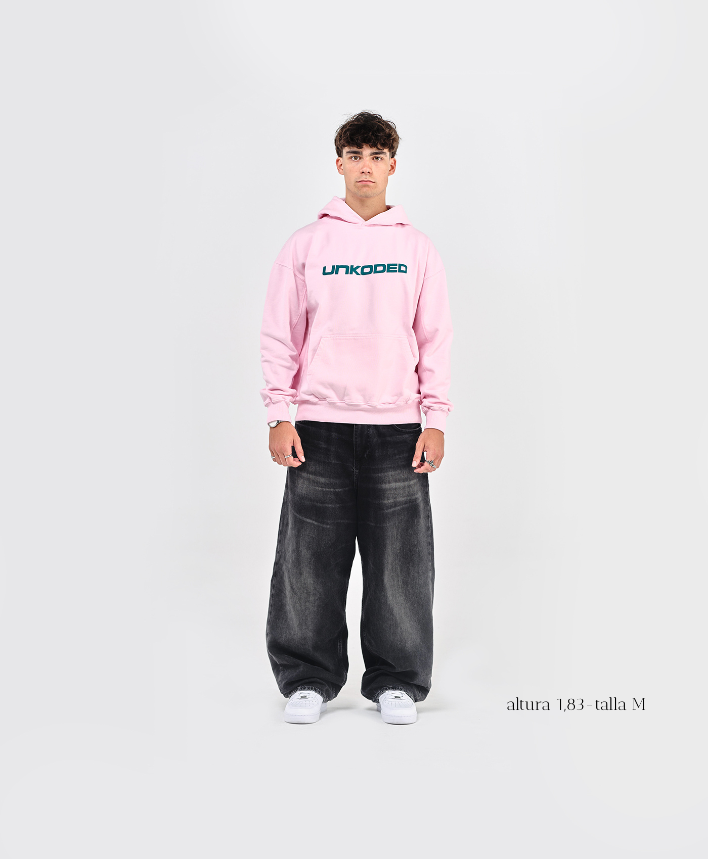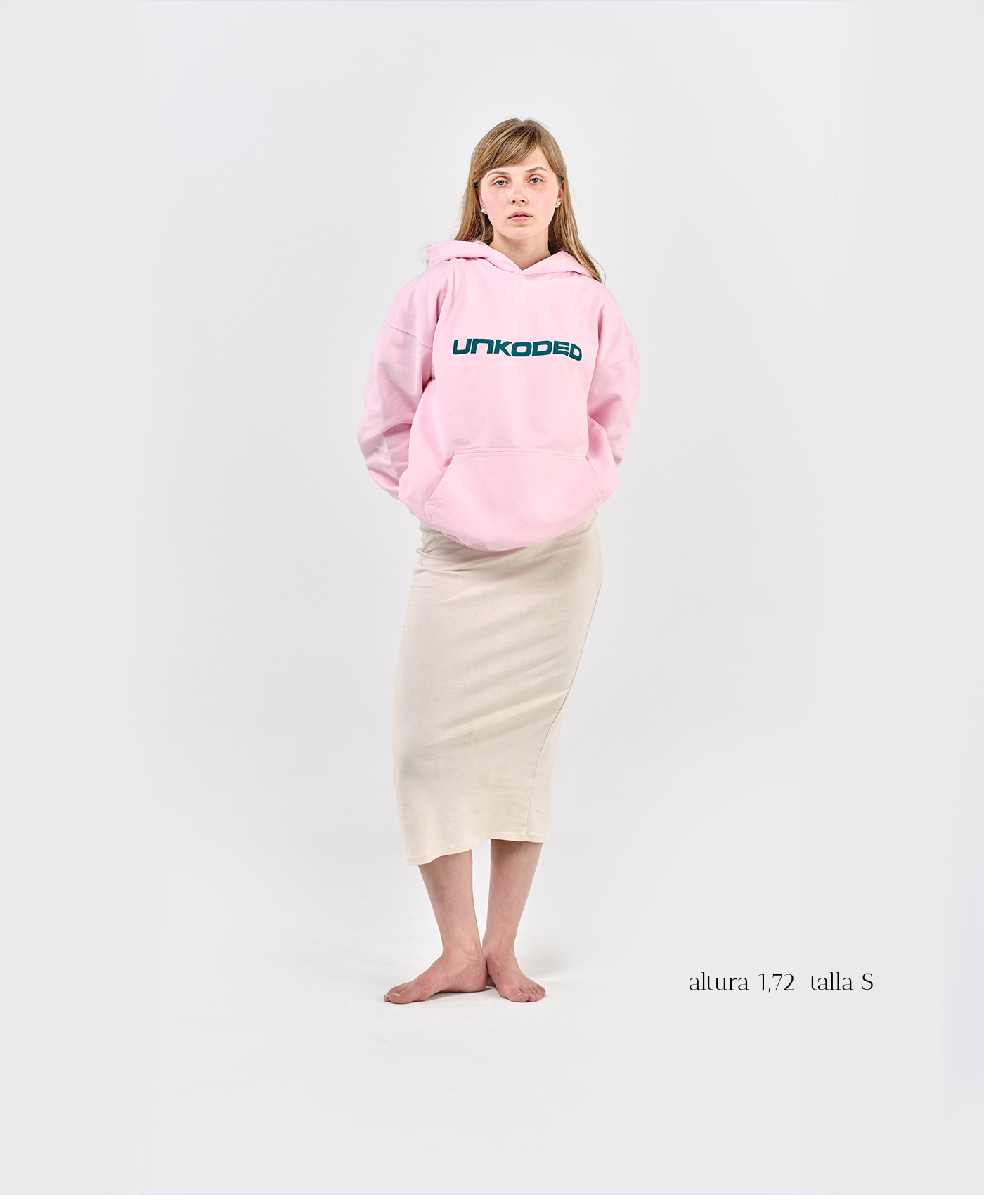 Sudadera oversize unisex en color rosa pastel, confeccionada en algodón grueso de alta calidad para un ajuste cómodo. Incluye capucha con cordón, bolsillo tipo canguro y un logotipo UNKODED impreso en color verde petróleo en la parte frontal.